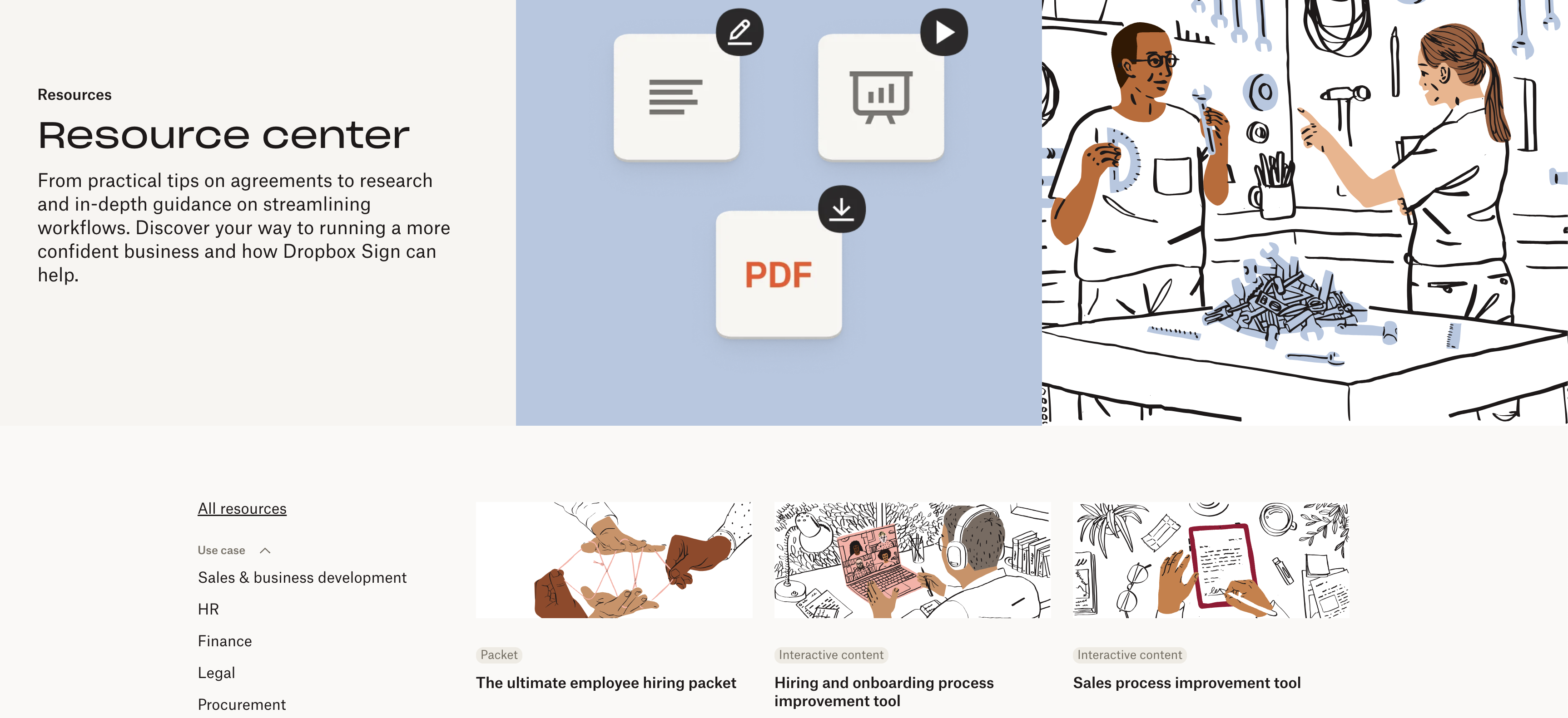 As the teams worked to integrate the HelloSign site into the Dropbox family, they realized they had a variety of marketing resources—ebooks, webinars, infographics—in disparate digital locations. Split across multiple CMS collections without a unified structure or visual language, these resources were often inaccessible outside of specific marketing campaigns. In order to ramp up content production and drive more downloads, the team needed to quickly bring all assets into an intuitive Resource Center that was simple for readers to browse and easy to manage.